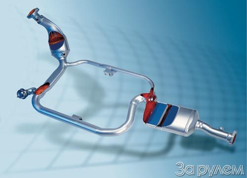 Фирма "Эберспехер", больше известная отопителями и подогревателями, предложила сразу два решения. В первом случае выхлопная система состоит из двух труб, толстой и тонкой. Они соединяют обычный нейтрализатор с дополнительным - противоазотным. При пуске мотора или на режимах малой нагрузки выхлопные газы идут по короткой тонкой трубе, почти не охлаждаясь в ней. Второй, более широкий и длинный путь перекрыт жаропрочной заслонкой: ею управляет электроника. По мере увеличения нагрузки, когда водитель "поддает газу", заслонка приоткрывается и выхлопные газы теряют температуру в более толстой и длинной трубе, теплоотдача которой значительно выше.
