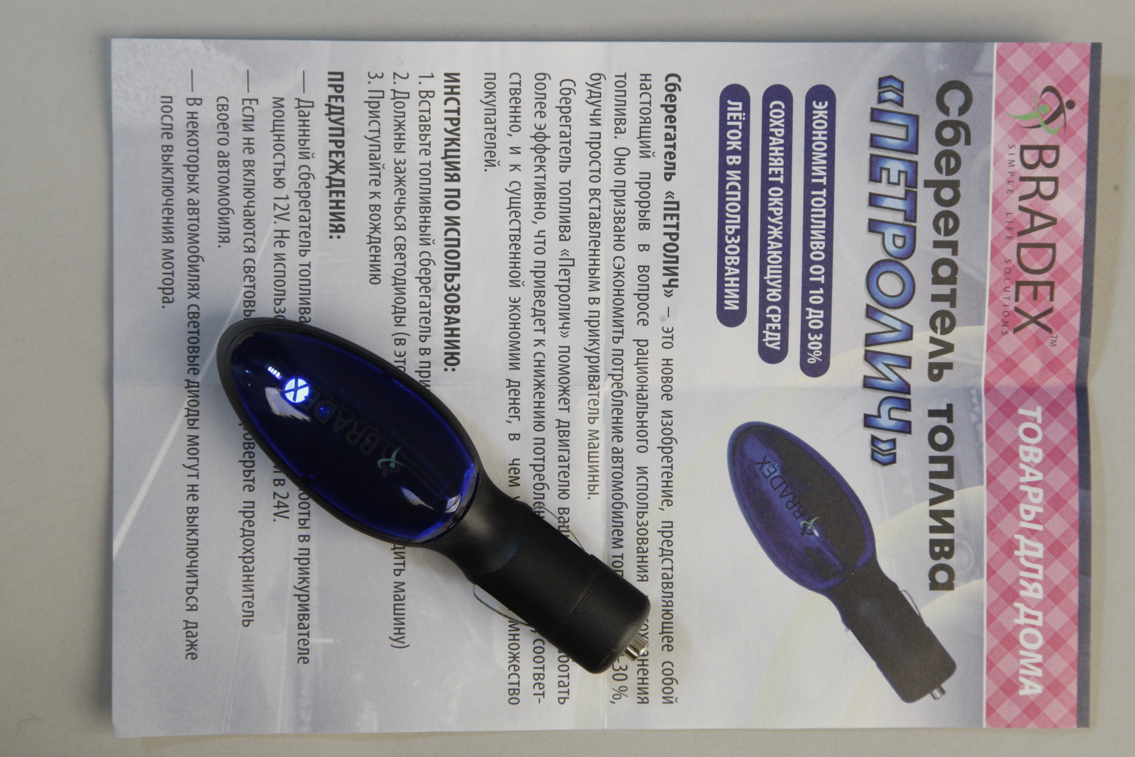 Сегодня эту хрень называют Fuel Shark. Хрень втыкается в гнездо прикуривателя. Внутри – светодиодик и конденсатор. Светодиодик зажигается – все честно. И еще хрень обещает снизить расход топлива. То ли на 10%, то ли на 30 – не помню.