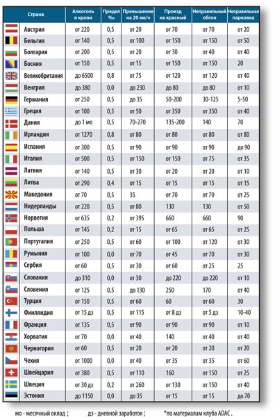 В наступившем году штрафы выросли не только в России, но и в ряде стран Европы. Так, в Греции ввели настоящий «счетчик»: если не оплатить штраф в течение 10 дней, сумма автоматически удваивается! А она немалая – проезд на красный свет или нарушение правил обгона стоит здесь 350 евро. Кое-где деньги вообще не помогут, и отпуск придется удлинить до трех месяцев с отбыванием срока в местной тюрьме. Таковы, например, наказания в Испании за превышение скорости на 60 км/ч либо концентрацию алкоголя в крови свыше 1,2 промилле. Шведы в кутузку не бросят, зато за показания алкометра всего в 0,2 промилле придется расплатиться месячным окладом.