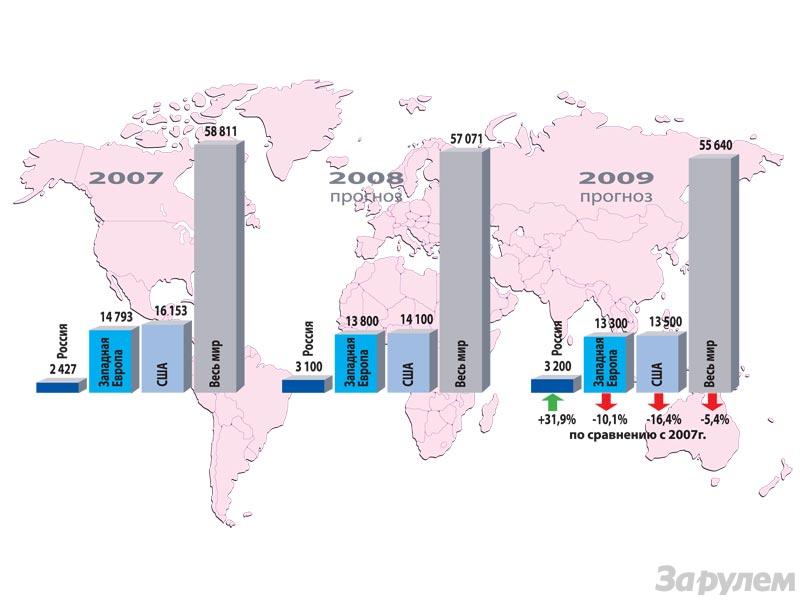 Европейские аналитики сделали любопытный прогноз продаж в ряде регионов на 2008–2009 годы. Как видно, сильнее всего кризис ударил (и еще ударит) по США, затем идет Западная Европа. А вот в России рассчитывают на стабильный, хотя и замедленный рост. При том в относительном выражении его темпы будут заметно выше, чем в Китае (+11,1%), Индии (+10,0%) и Бразилии (+1,3%). Продолжение кризисной темы – в разделе «Экономика».