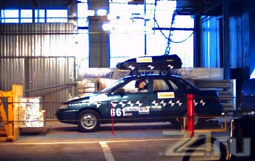 Для крэш-теста ВАЗ-21102 "усилили" прицепом белорусского производства, а также челябинским закрытым багажником на крышу типа "финбокс". Тест проходил по методике EuroNCAP - фронтальный удар с 40-процентным смещением в деформируемое препятствие произошел на скорости 64 км/ч.