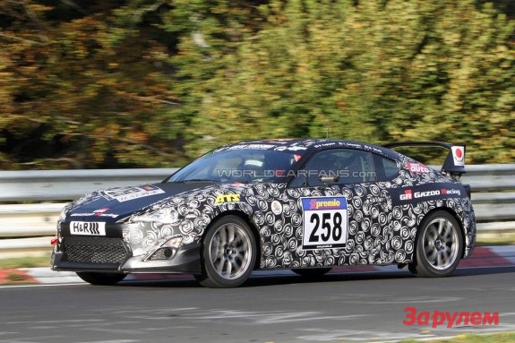 Похожую картину мы сейчас наблюдаем с куда менее эксклюзивным спорткаром концернов Toyota Motor и Fuji Heavy Industries – новой двухдверкой FT-86. Несмотря на то, что серийная «Субаёта» впервые покажется на автосалоне в Токио в начале декабря, ее «боевую» версию уже пришпорили пилоты Кагаяма Масахико, Такаки Минору и Кацумата Есинобу на прошедшем в субботу состязании на Нюрбургринге.