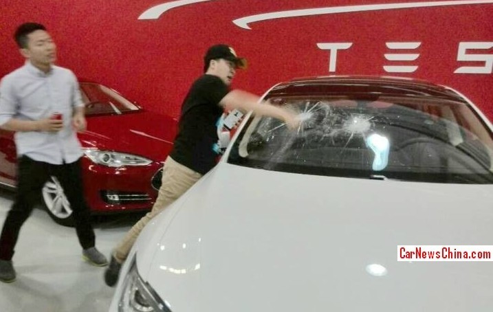 27 июня он, вооружившись гаечным ключом, пришел в пекинский салон Tesla и разгромил новенькую белую Tesla Model S, отомстив таким образом высокомерной компании. Рассерженный покупатель заявил, что теперь будет выступать против деятельности Tesla на территории Китая.
