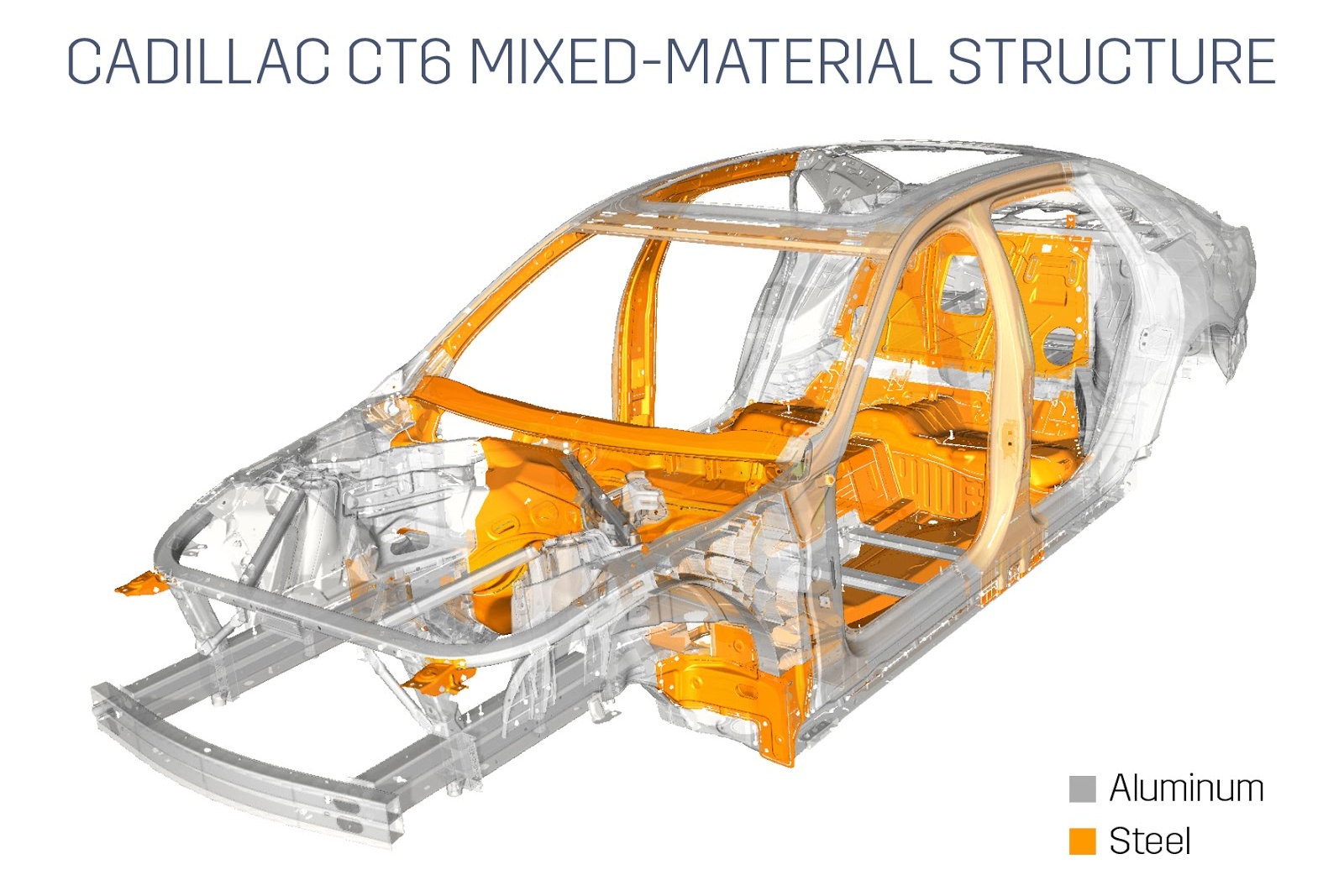 Несущая конструкция седана Cadillac CT6 состоит из 11 различных материалов и почти на две трети – из «крылатого металла». Такая сверхжесткая пространственная рама примерно на 90 кг легче аналогичной стальной. Высокопрочные стали использованы в основном в «пассажирской клетке» – они, как оказалось, не только дешевле, но и заметно лучше алюминия в плане звукоизоляции салона. Также в GM утверждают, что особенно сложная штамповка заменена литьем – это позволяет избавиться от дорогостоящих матриц (в некоторых случаях – сразу от 35 отдельных деталей).