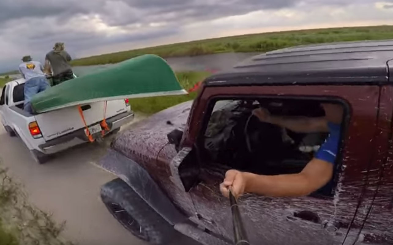 Автора и главного героя этого видео зовут Алекс Лопатнюк, так что, возможно, это наш соотечественник, но действие клипа разворачивается во Флориде. Караван из нескольких вседорожников отправляется, как говорится в описании ролика, на охоту за аллигаторами: видимо, именно для этой цели передний пикап везет в багажнике длиннейшую байдарку. Она-то и становится неожиданным препятствием на пути навороченного Jeep Wrangler, водитель которого отвлекается от дороги, чтобы сделать селфи.