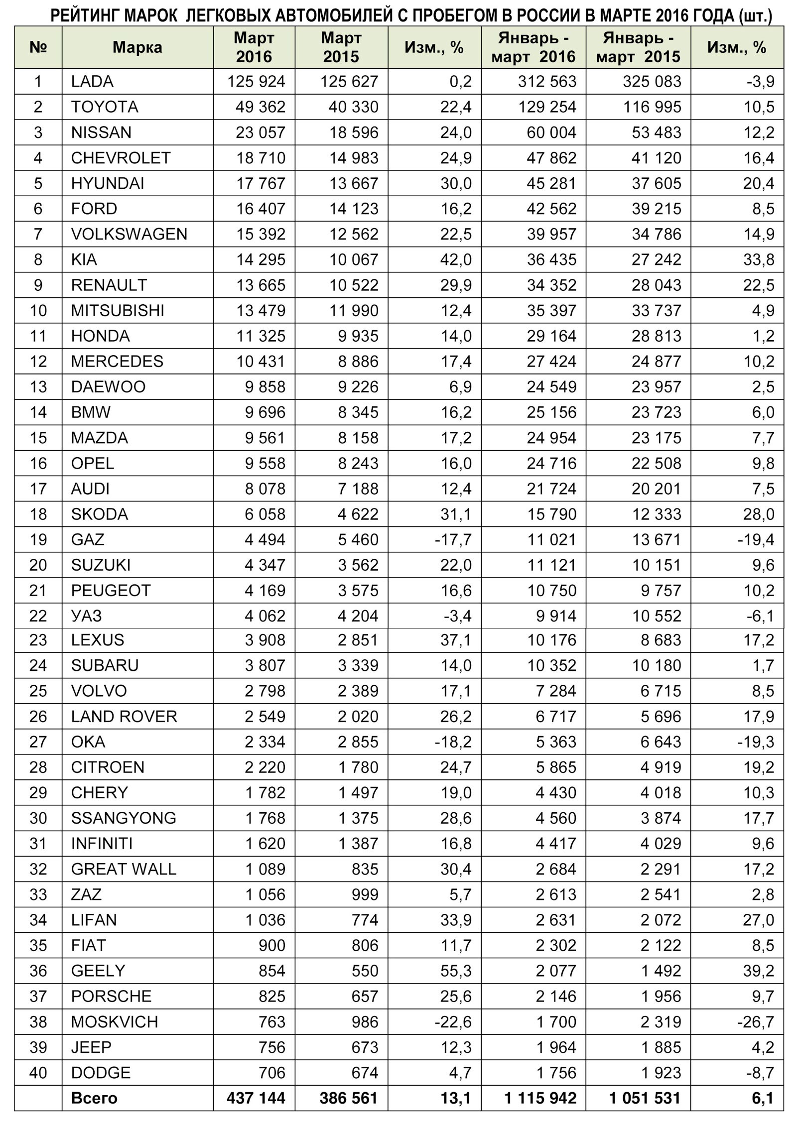 Согласно данным «Автостата», в марте 2016 года объем рынка легковых автомобилей с пробегом в России составил 437,1 тыс. единиц, что на 13,1% больше, чем годом ранее. Если учесть, что в феврале продажи выросли на 10,9%, а в январе продемонстрировали лишь небольшое снижение, можно говорить о том, что наметилась тенденция. В целом по итогам первого квартала рынок показал рост на 6,1%.