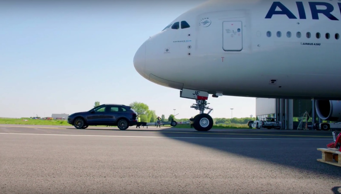 Низкий полет над автобаном с каким-нибудь суперкаром на хвосте — это одно, и совсем другое, когда панораму в зеркалах заднего вида занимает Airbus, а могучий кроссовер напрягает все «мускулы» как пауэрлифтер перед взятием веса. Небесная машина массой 285 тонн считается самой большой в мире среди себе подобных. На ее фоне Porsche – сущая букашка. Но это очень сильное «насекомое»! Рекорд в международном парижском аэропорту «Шарль-де-Голль» установили в два приема. Сначала самолет утащил за собой Cayenne S Diesel с 4,1-литровой «восьмеркой» на «тяжелом топливе», выдающей 385 л.с. при 3750 об/мин и 850 Нм в диапазоне 2000-2750 об/мин, которые были очень кстати при выполнении совершенно нестандартной задачи. Для попадания в историю хватило 42 метров. Позже самолет протянула бензиновая модификация Turbo S с 4,8-литровым агрегатом (570 л.с. при 6000 об/мин и 800 Нм при 2500-4000 об/мин). В «соавторах» рекорда числится Ричард Пэйн, технический специалист британского подразделения Porsche.
