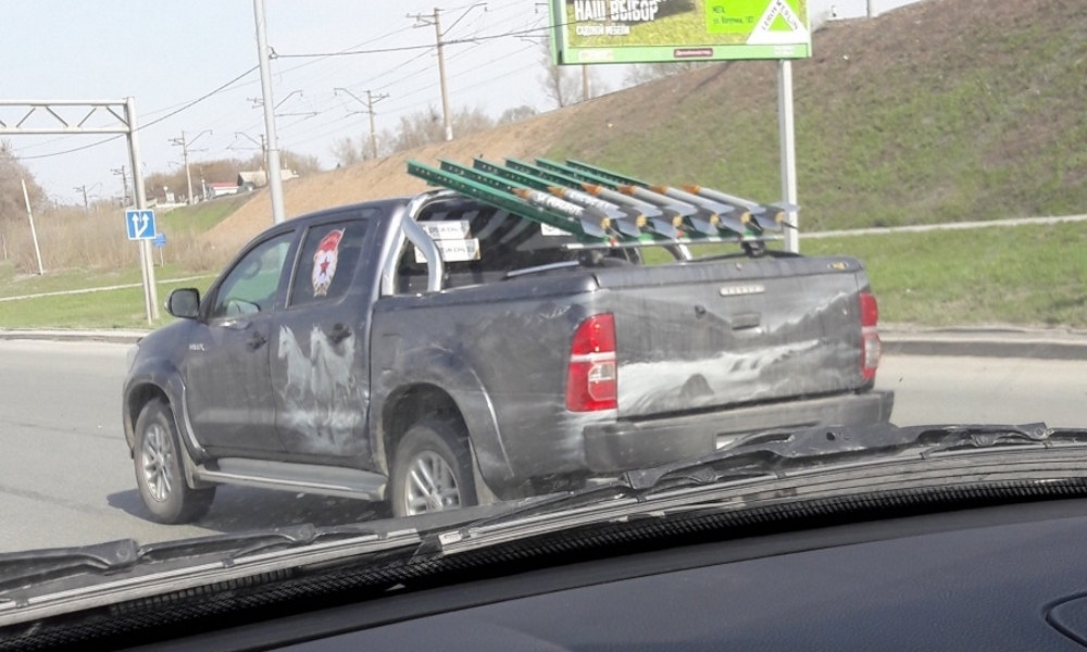 Снимки нестандартно украшенных к 9 мая автомобилей опубликовал новосибирский ресурс «НГС.НОВОСТИ». Пикап Toyota Hilux с муляжом пусковой установки системы залпового огня был сфотографирован читателем издания на Бердском шоссе в районе его пересечения с проспектом Строителей. Комплект наклеек на машине, впрочем, тоже имеется.