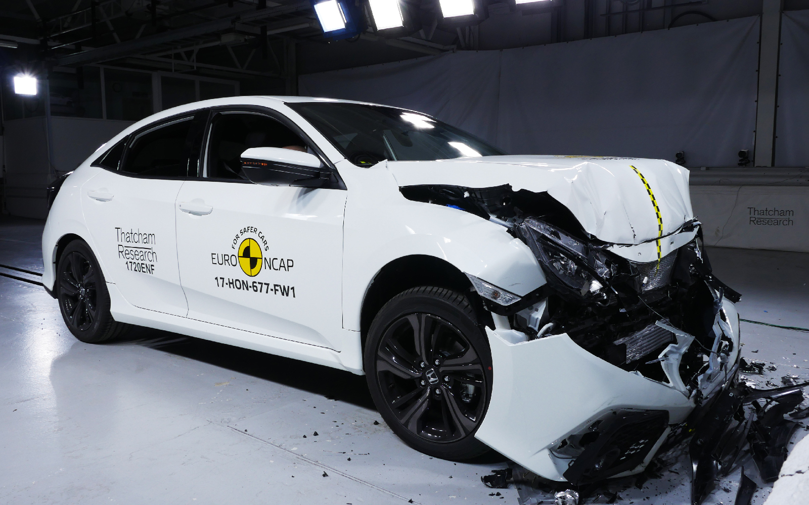 Не оправдал ожиданий испытателей хэтчбек Honda Civic десятого поколения. Автомобиль плохо проявил себя при фронтальном ударе о стену: датчики манекена на заднем сиденье зафиксировали повышенный (коричневый) уровень нагрузок на грудную клетку – высок риск получения переломов ребер. Неудовлетворительной была признана защита от хлыстовых травм на заднем сиденье – подголовники нуждаются в доработке. Есть претензии и к защите детей: при фронтальном ударе датчики 10-летней куклы зафиксировали критический (красный) уровень нагрузок на шею, 6-летняя обнаружила повышенный (коричневый) уровень нагрузок на грудную клетку. При боковом ударе у 10-летней куклы зафиксирован критический (красный) уровень нагрузок на голову.