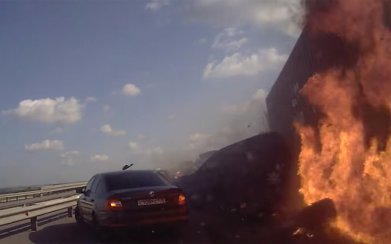 Несмотря на то, что авария произошла в минувшее воскресенье, подробности о ней начали появляться в соцсетях только сейчас. На одном из видеороликов заснят момент столкновения фуры с другими автомобилями, однако начало аварии, которая произошла на спуске трассы, осталось за кадром.
