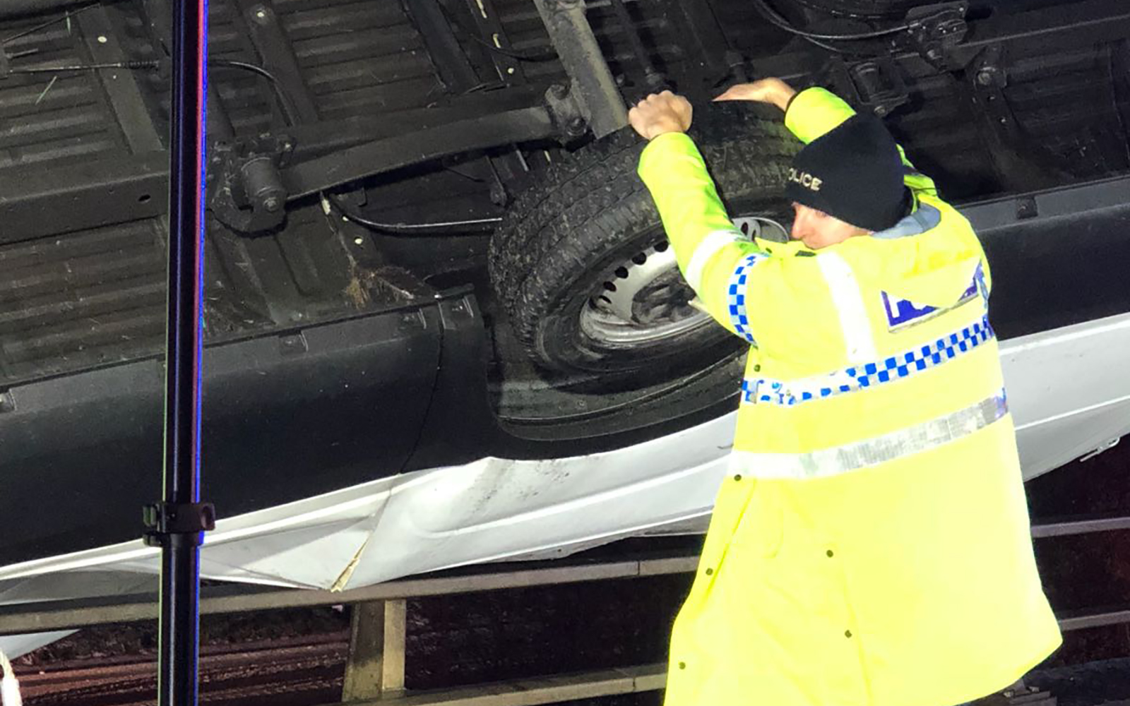 «Я просто делал свою работу»: полицейский руками удержал повисший на мосту фургон