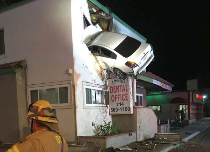 Капитан Стивен Хорнер из Управления пожарной охраны округа Ориндж рассказал, что машина двигалась с прилегающей улицы, когда водитель не справился с управлением. Автомобиль врезался в отбойник, который подбросил его вверх и направил в сторону офисного здания. Водитель и пассажир выжили, но если водителя удалось освободить сразу, то его спутник застрял и просидел в машине около полутора часов, прежде чем его удалось вызволить, сообщило издание rediff.com.
