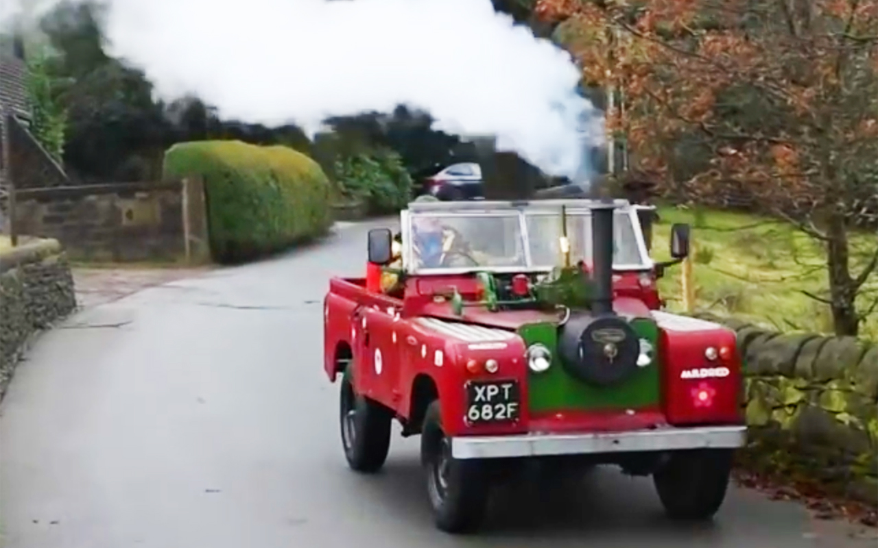 На переоборудование красного внедорожника Land Rover Defender 67-летний энтузиаст тягового дела Френк Ротвелл из Олдхэма потратил более 400 часов. Чертежи он сделал сам, двигатель построили на заказ, и работает он по типу паровоза: в топку кидают уголь, тепло от горения превращает воду в котле в пар. Пар выходит через отверстие в цилиндр, где находится подвижный поршень, давит на него, тот двигает шатун, который, в свою очередь, крутит маховик.