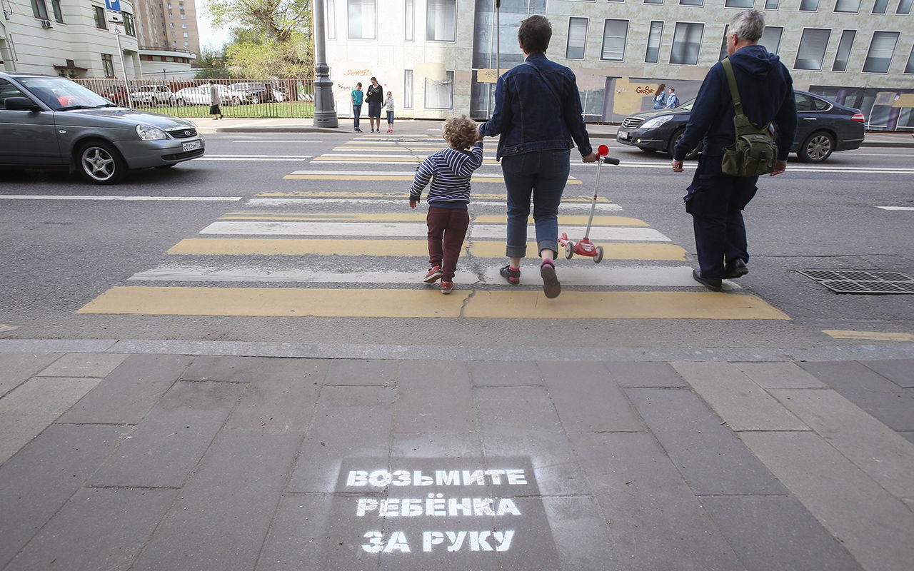 Надписи на тротуарах перед пешеходными переходами, впервые появившиеся 4 мая этого года, стали напоминанием зазевавшимся людям о том, что впереди – опасность. По мнению работников Центра организации дорожного движения Москвы, надписи «Возьмите ребенка за руку», «Посмотрите по сторонам» и «Снимите наушники» могут сократить количество ДТП на пешеходных переходах. Будучи нанесенными на тротуар, они будут заметными для тех, кто увлекся перепиской в телефоне или просто не смотрит по сторонам.