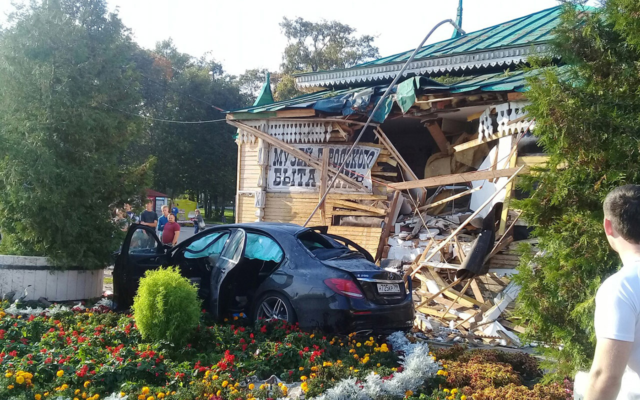 Авария произошла в городе Угличе Ярославской области. На записи видно, как черный Mercedes-Benz E200 проносится через перекресток и таранит здание местного Музея городского быта.