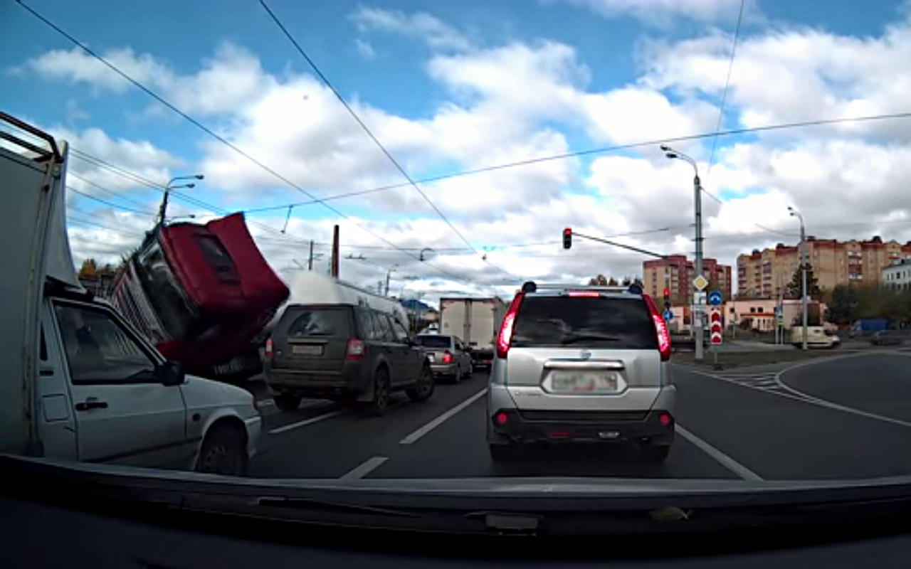 Так, например, в Казани цементовоз завалился на стоящие перед светофором автомобили, помяв несколько из них. На видеозаписи с регистратора одной из машин видно, что грузовик входит в поворот на слишком большой скорости. В конце маневра его правые колеса отрываются от земли, и автомобиль валится на левый бок. Скользя по асфальту, фура врезается в стоящие перед светофором автомобили, сдвигая их.