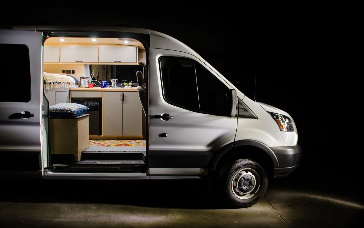 Жилое пространство автомобиля отделано светлой березой и обставлено сделанной на заказ мебелью Formica. Мини-кухня оборудована газовыми конфорками, холодильником объемом 85 литров, раковиной из нержавеющей стали, которая превращается в столешницу, и электрического насоса, собирающего воду в резервуар с отходами. Унитаз Baltic Birch прячется в шкафу возле выхода. Предусмотрена также система вентиляции, состоящая из двух вентиляторов Maxxair в крыше фургона.