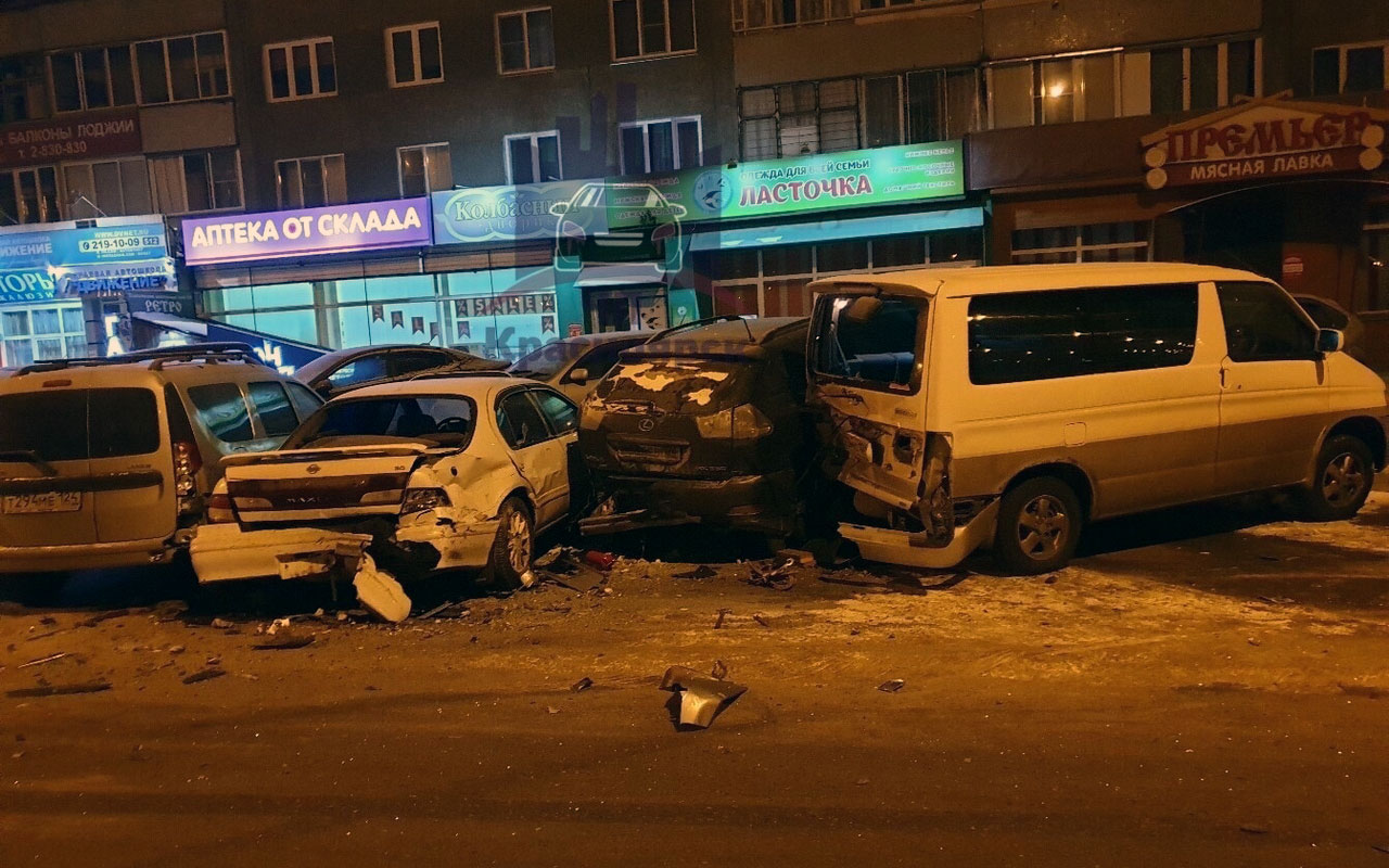 Этой ночью в Красноярске произошло ДТП по вине пьяного водителя. Управляя автомобилем Toyota, он не справился с управлением и протаранил шесть машин, припаркованных возле дома 76 по улице Щорса. Фотографии ДТП появились сегодня в сети ВКонтакте. Авария произошла около 3 часов 35 минут. Пострадавшие автомобили стояли вдоль обочины.