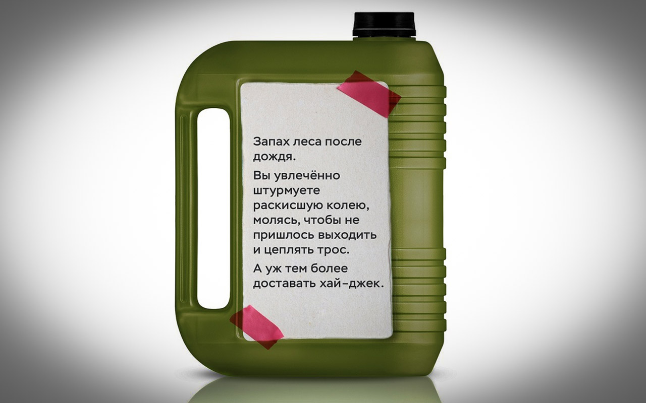Авторы поста призывали выбрать наиболее подходящий вариант. Среди предложенных, например, был «Запах вечера на природе. Закатное солнце играет бликами на капоте. Пахнет шашлыками и спреем от комаров. Смеются друзья, вам снова по 20 лет». На других канистрах столь же поэтично описаны «запах утра, когда вы отправляетесь в путешествие», «запах нагретого солнцем асфальта» и другие. Но можно было, конечно, и предложить свои собственные варианты уазовских запахов.