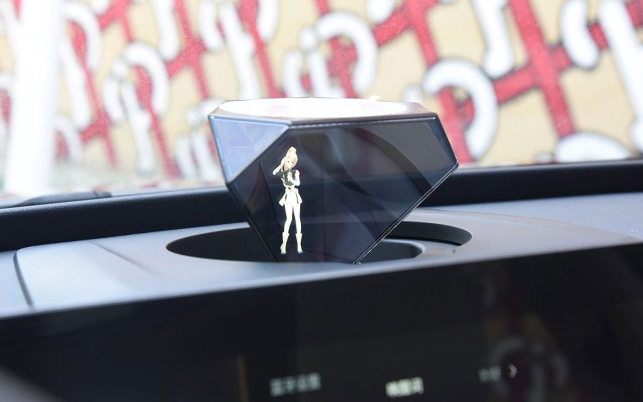 Но самое интересное внутри автомобиля. Это первый виртуальный голографический голосовой помощник, 3D-фигурка которого находится в кристалле вверху центральной консоли. Причем клиенты смогут выбирать того или иного персонажа.