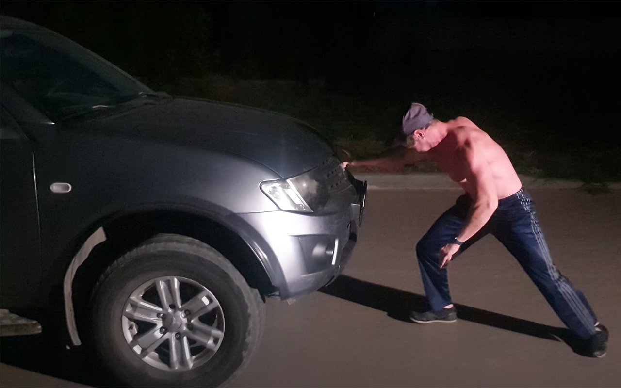 Герои ролика — Mitsubishi L200 и хорошо сложенный спортивный мужчина, который объявляет, что может одним пальцем толкнуть авто весом 1900 кг. Сначала он демонстрирует, что в пикапе никого нет, а стало быть, ему никто изнутри не помогает.