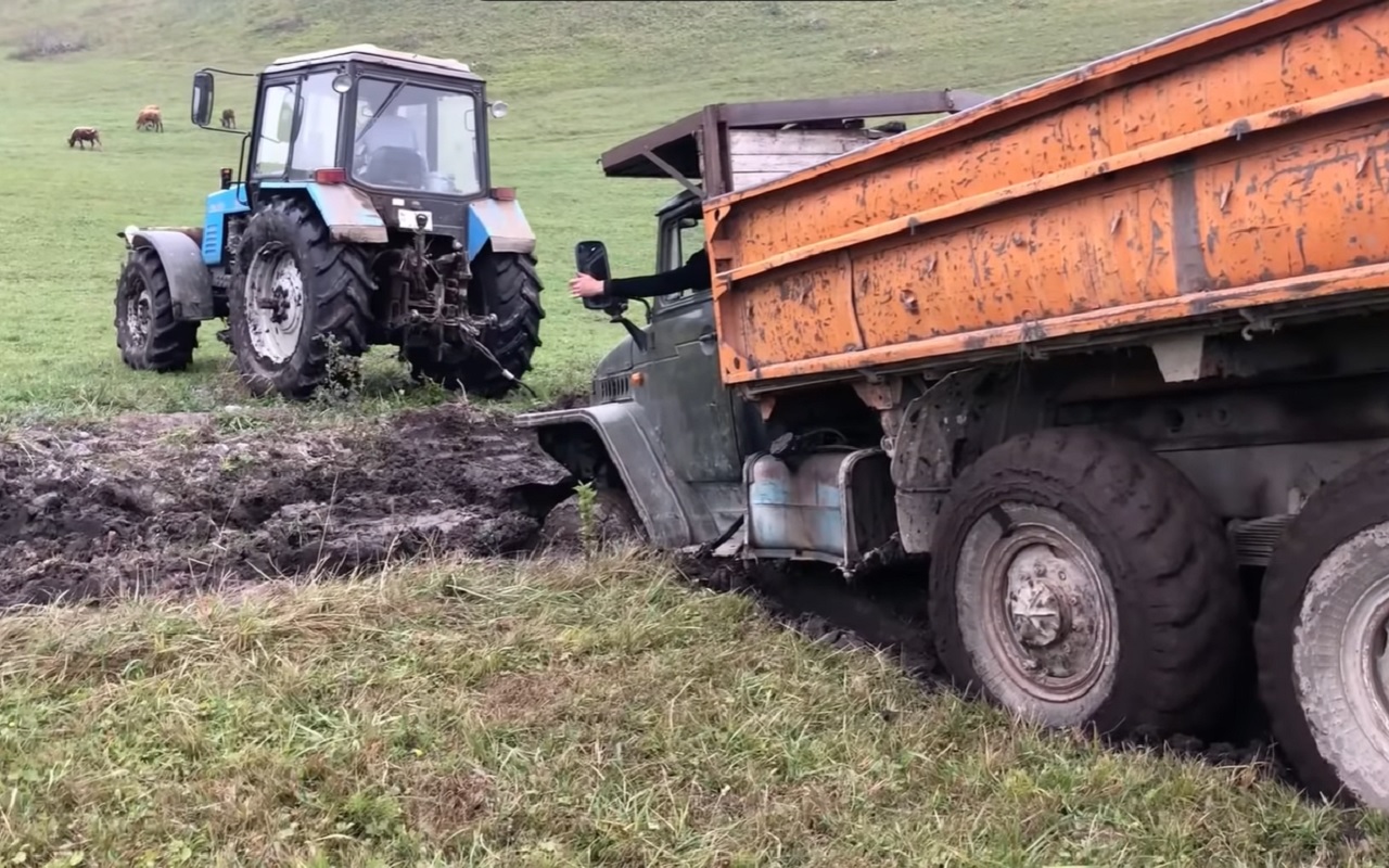 Тянем-потянем: трактор Беларус и застрявший Урал 6х6 (видео)