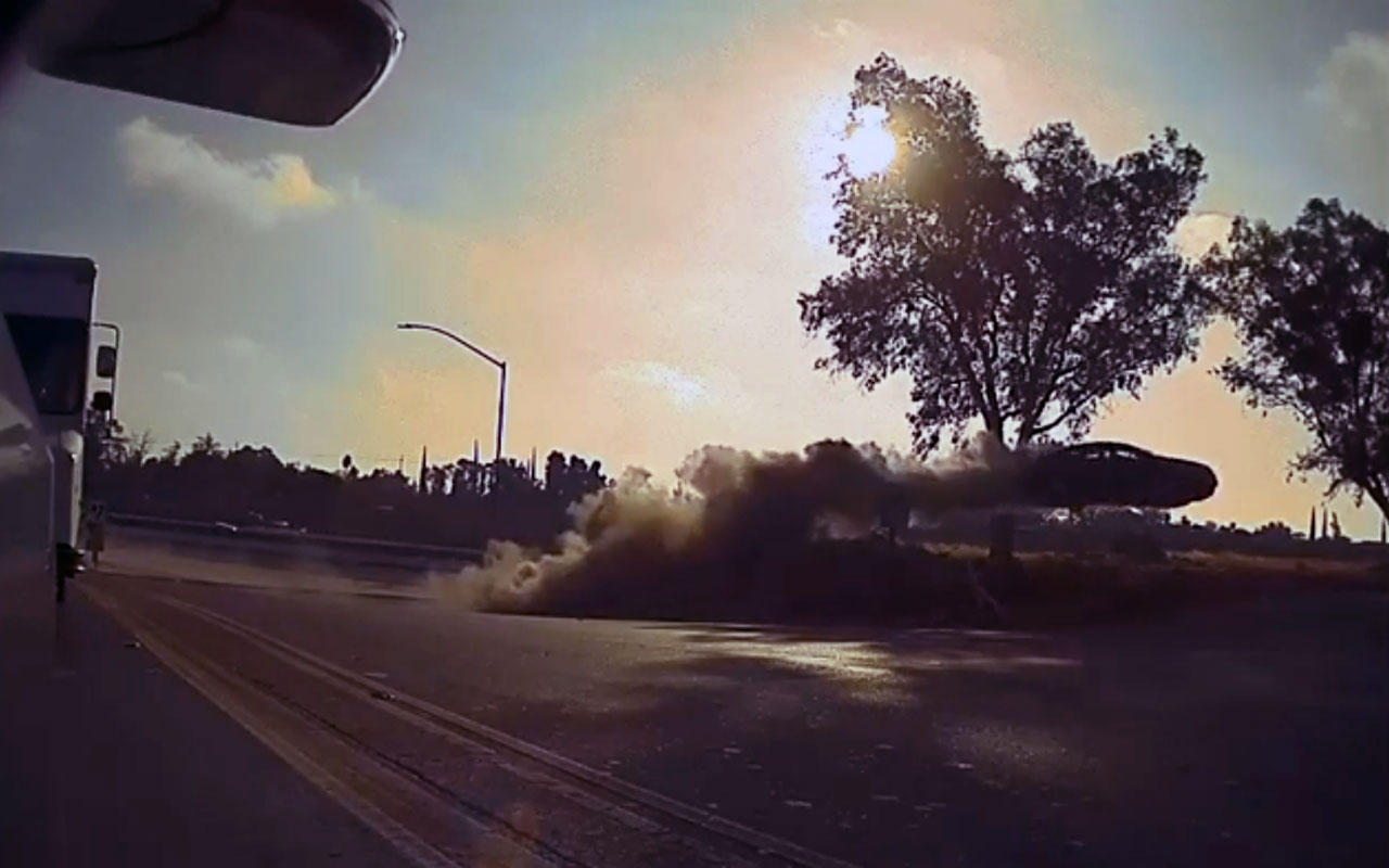 Эпичные кадры сняла боковая камера электромобиля Tesla Model 3, стоявшего в пробке поблизости. Видно, как автомобиль перескакивает через бордюр обочины шоссе, поднимает передние колеса над землей, а затем врезается в насыпь и летит, оставляя за собой густой шлейф похожей на дым пыли. Получилось очень зрелищно и по-голливудски эффектно.