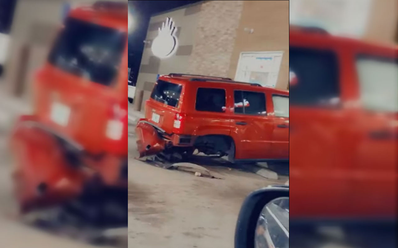 Водитель пикапа решает сдернуть внедорожник с разгона и… вырывает колесо вместе с деталями подвески, которые россыпью катятся по парковке. Также был изуродован и задний бампер внедорожника, а сам Liberty с места так и не сдвинулся.