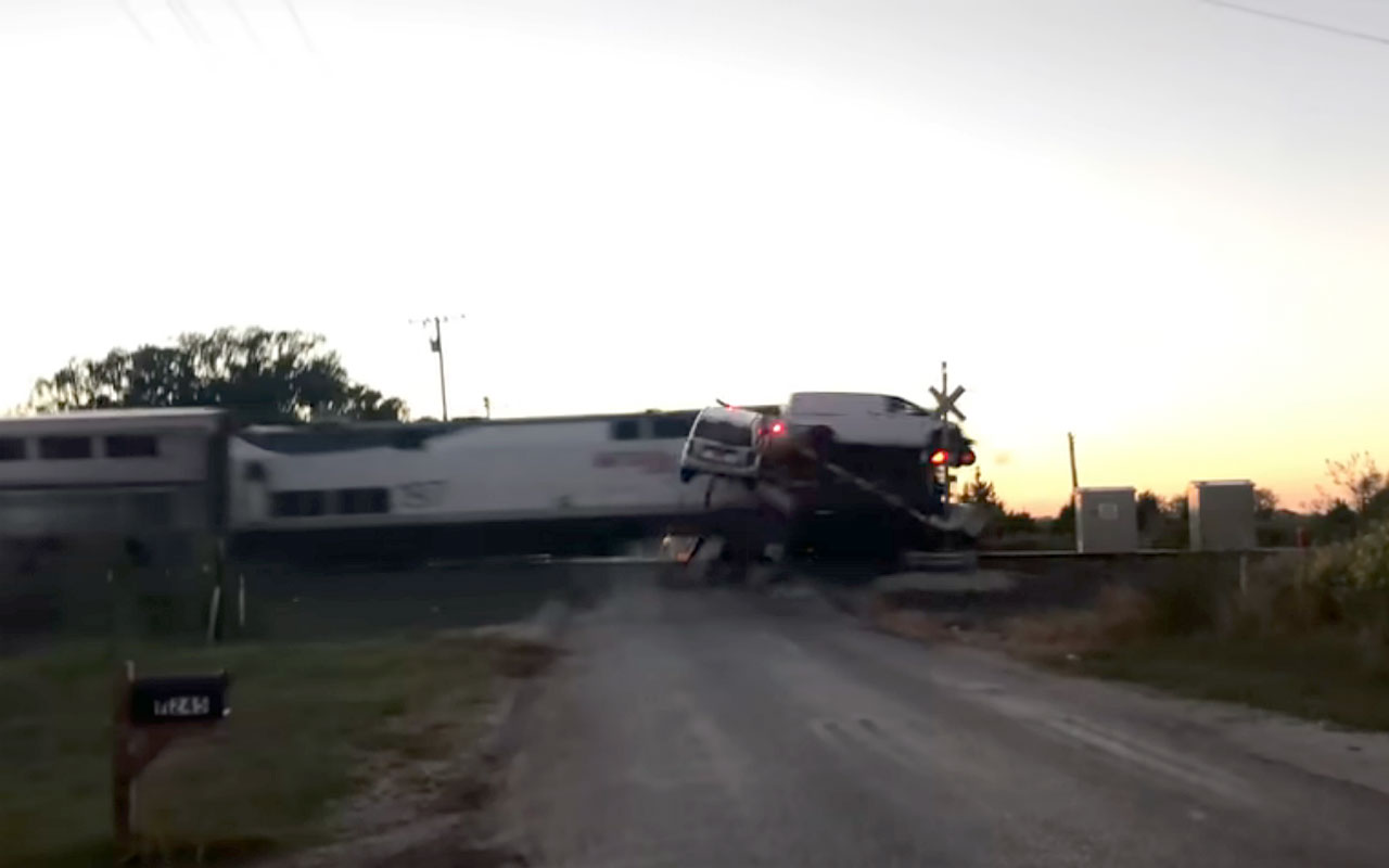 Поезд протаранил автовоз — видео разлетающихся машин