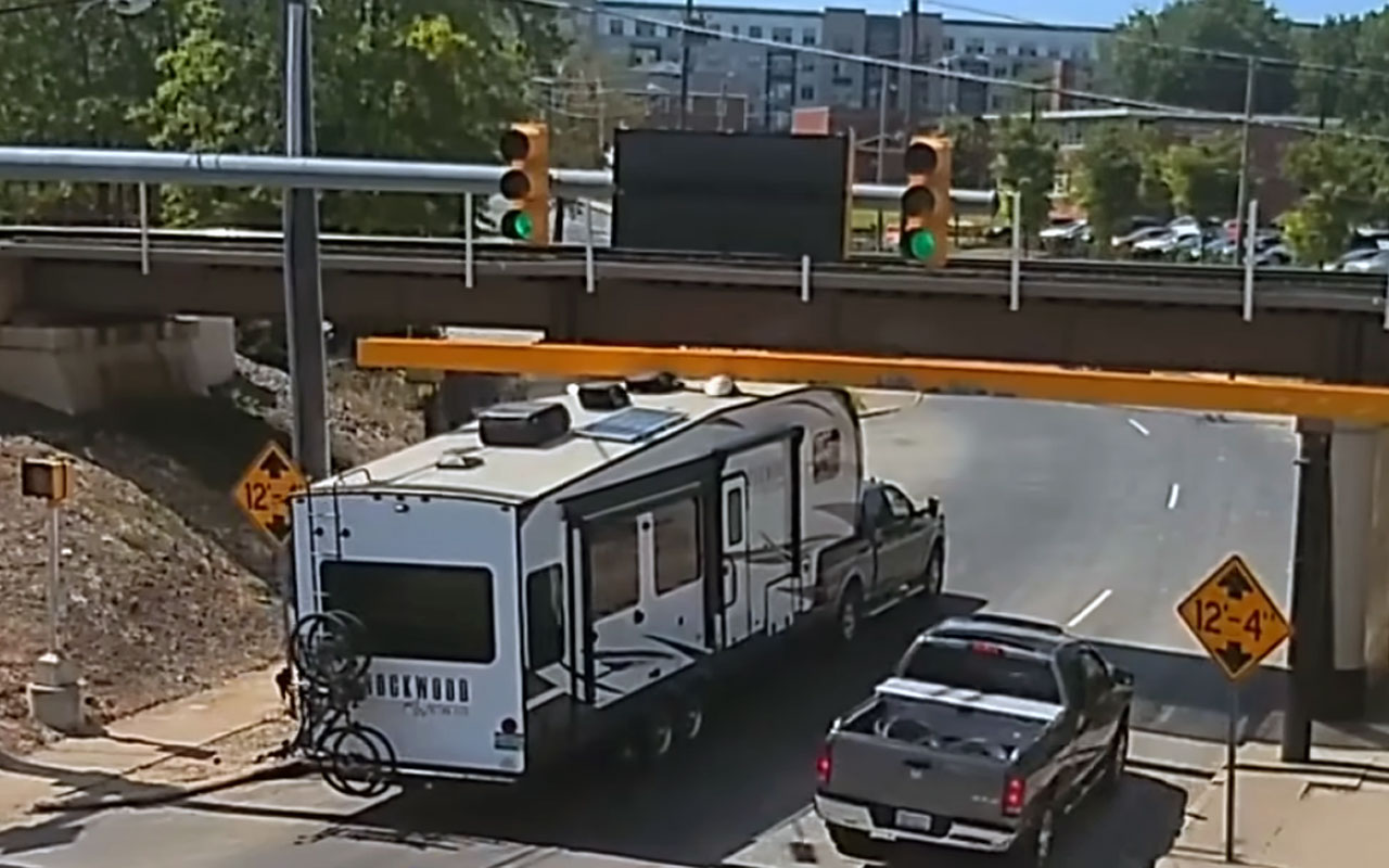Под этим мостом в США периодически калечатся автомобили, несмотря на множество предупреждений на перекрестке и даже специальное табло, на котором загорается надпись «Слишком высокий, должен свернуть», если со специального датчика приходит сигнал, что к мосту приближается слишком высокий автомобиль.