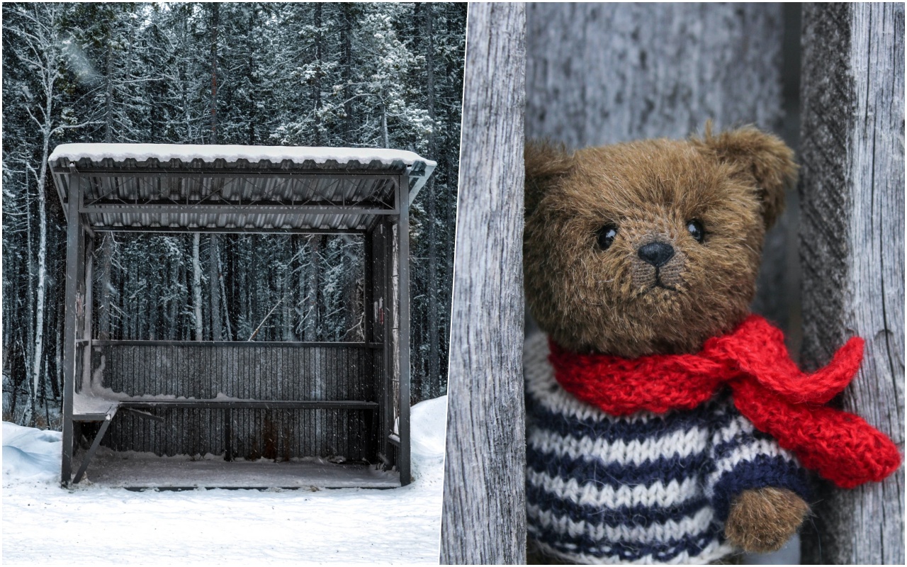 Житель поселка Таежный заснял медведицу с двумя медвежатами, спрятавшихся от пурги на остановке.