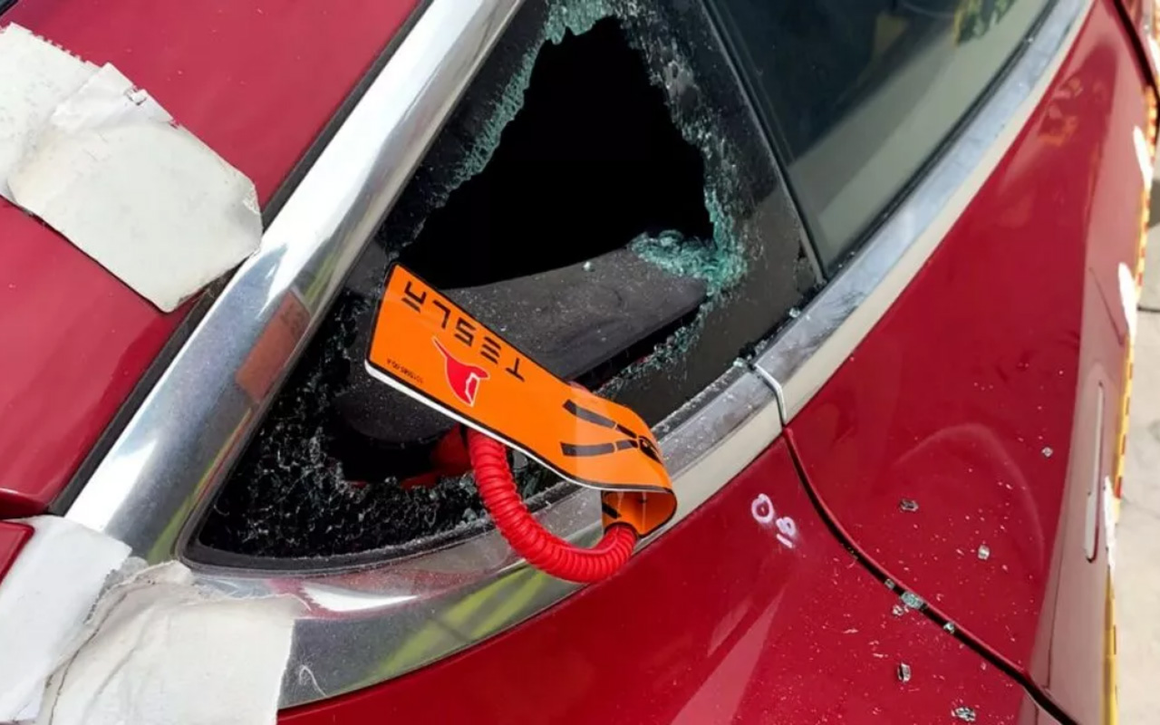 На фото ниже – Tesla Model 3. При серьезном ДТП нужно, во-первых, разбить заднюю правую «форточку». Затем отогнуть элемент внутренней отделки и вытащить красный кабель с оранжевой этикеткой.