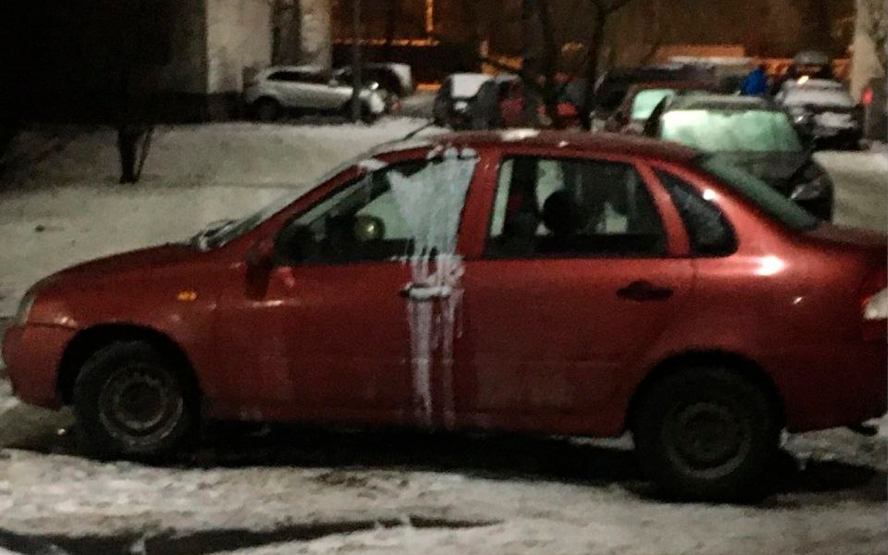 Как минимум три автомобиля (Lada Kalina, Lada Niva, Volkswagen Tiguan) оказались облиты кефиром.