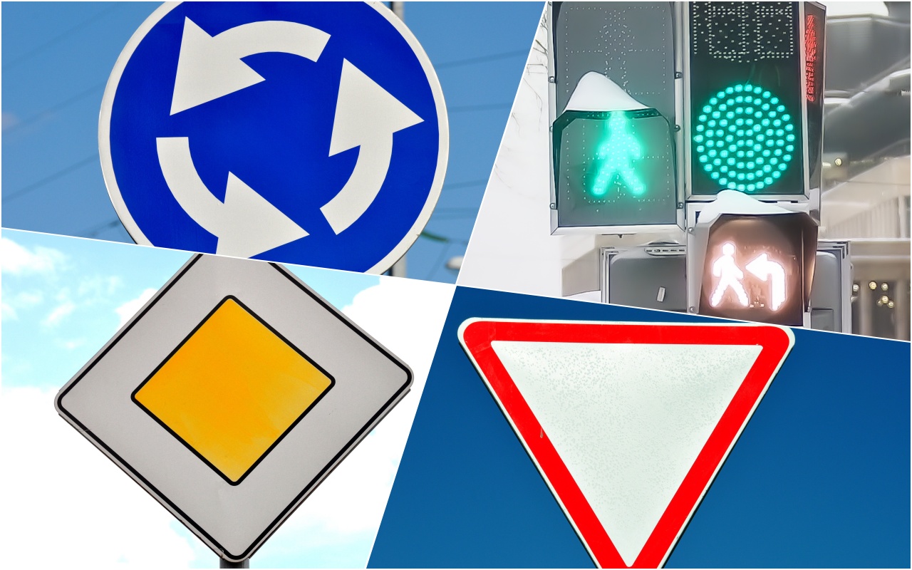 - Если светофор не работает, возвращаемся к началу этого списка и рассмотрению знаков: это знаки приоритета («Главная дорога» или «Уступи дорогу») и/или знак «Круговое движение».