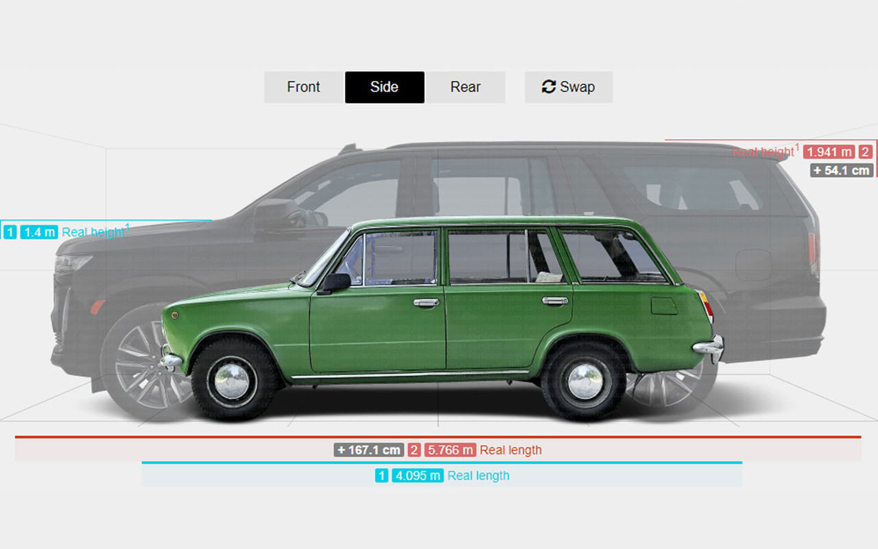 Согласно данным JATO за 2003 год, средняя длина легковых автомобилей в США составляла 196,5 дюйма (499,11 см). Для сравнения, это длина бизнес-седана, такого как Mercedes-Benz E-класса. Средняя ширина в том году составляла 73,4 дюйма (186,44 см).