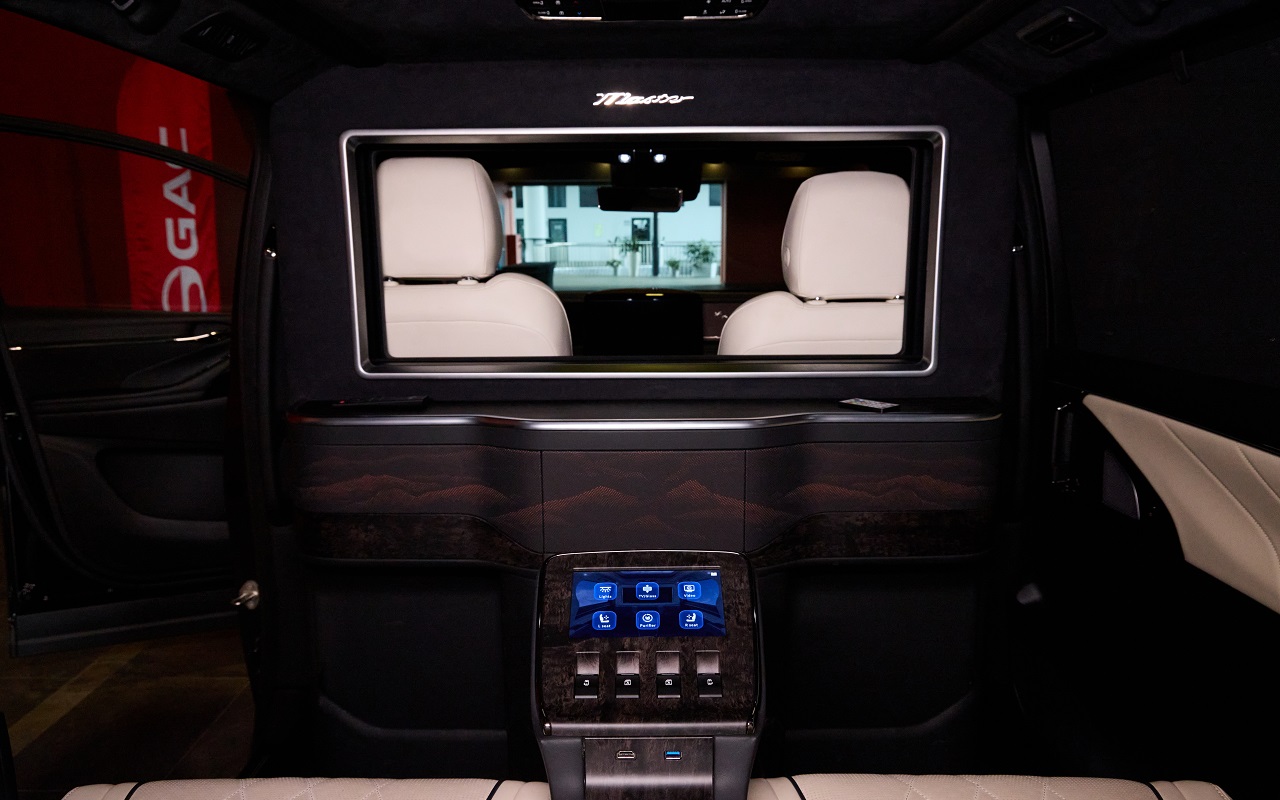 За экраном – электрохромное стекло с функцией затемнения для сохранения приватности. Благодаря этому можно без помех работать, смотреть фильмы или любимый контент. Кроме того, для второго ряда доступны независимая аудиосистема с 13 динамиками (включая сабвуфер), беспроводные зарядки у каждого кресла, USB-разъемы, столики, мини-бар с холодильником до –10°C.
