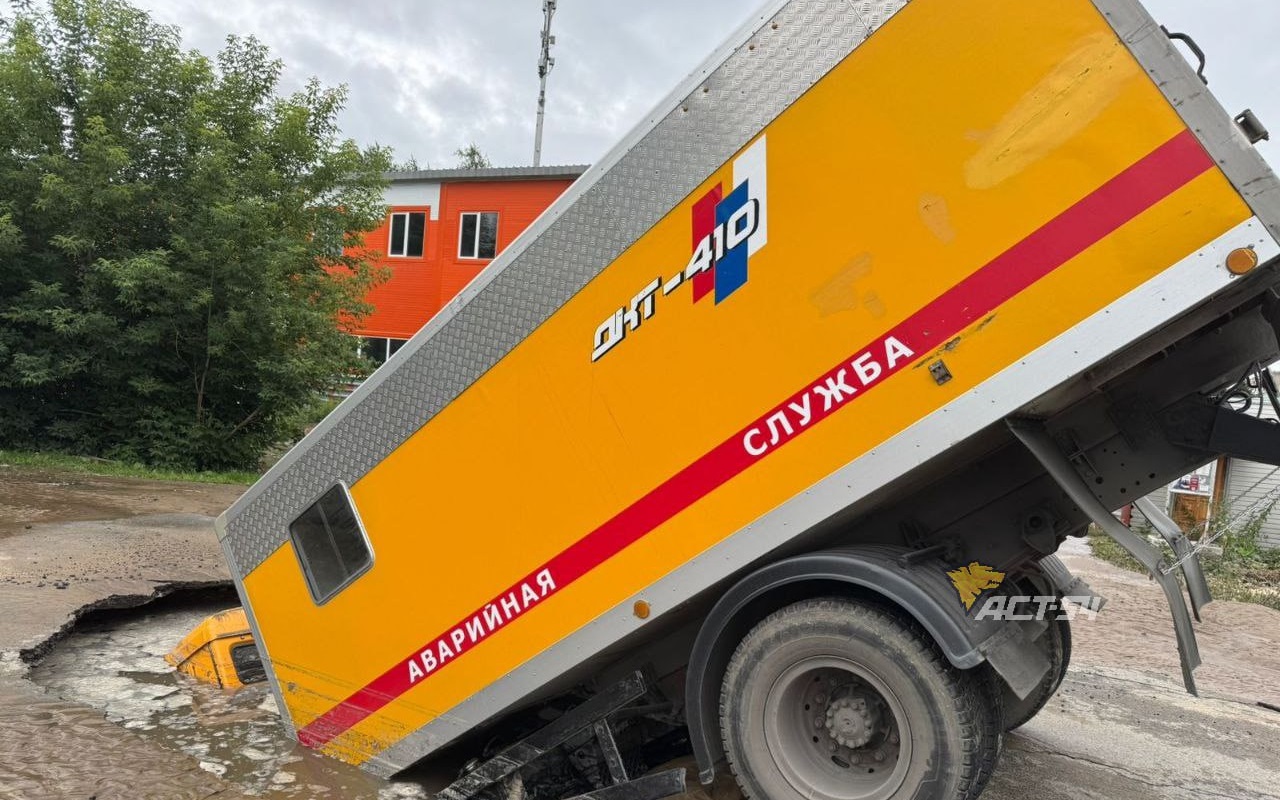 В минувшее воскресенье в Новосибирске под воду провалился КАМАЗ аварийной службы – кабина грузовика почти полностью ушла в провал дорожного полотна.