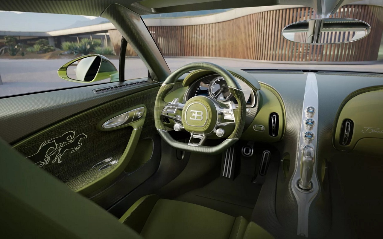 Особое внимание привлекает ручная скульптура лошади Бруйяр, установленная в салоне и заключенная в стеклянную вставку на переключателе передач, что является данью уважения к любимому скакуну основателя компании Этторе Бугатти.