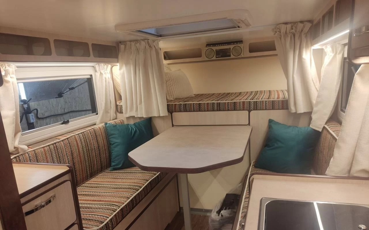 Габариты жилого модуля довольно внушительные: в длину он достигает 4,1 метра, в ширину – 1,93 метра, а в высоту – 1,58 метра. Под капотом машины тоже не осталось ничего родного – старый двигатель заменили на 2,4-литровый силовой агрегат Chrysler EDZ, который выдает примерно 137 лошадиных сил. За безопасность теперь отвечают дисковые тормоза на всех четырёх колёсах.